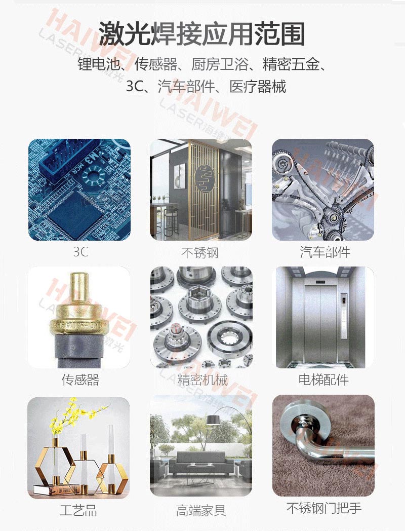 應(yīng)用領(lǐng)域:電池、消費電子、太陽能電池板、汽車零件、五金廚具、醫(yī)療器械、傳感器、模具、珠寶、眼鏡、不銹鋼門窗等行業(yè)。